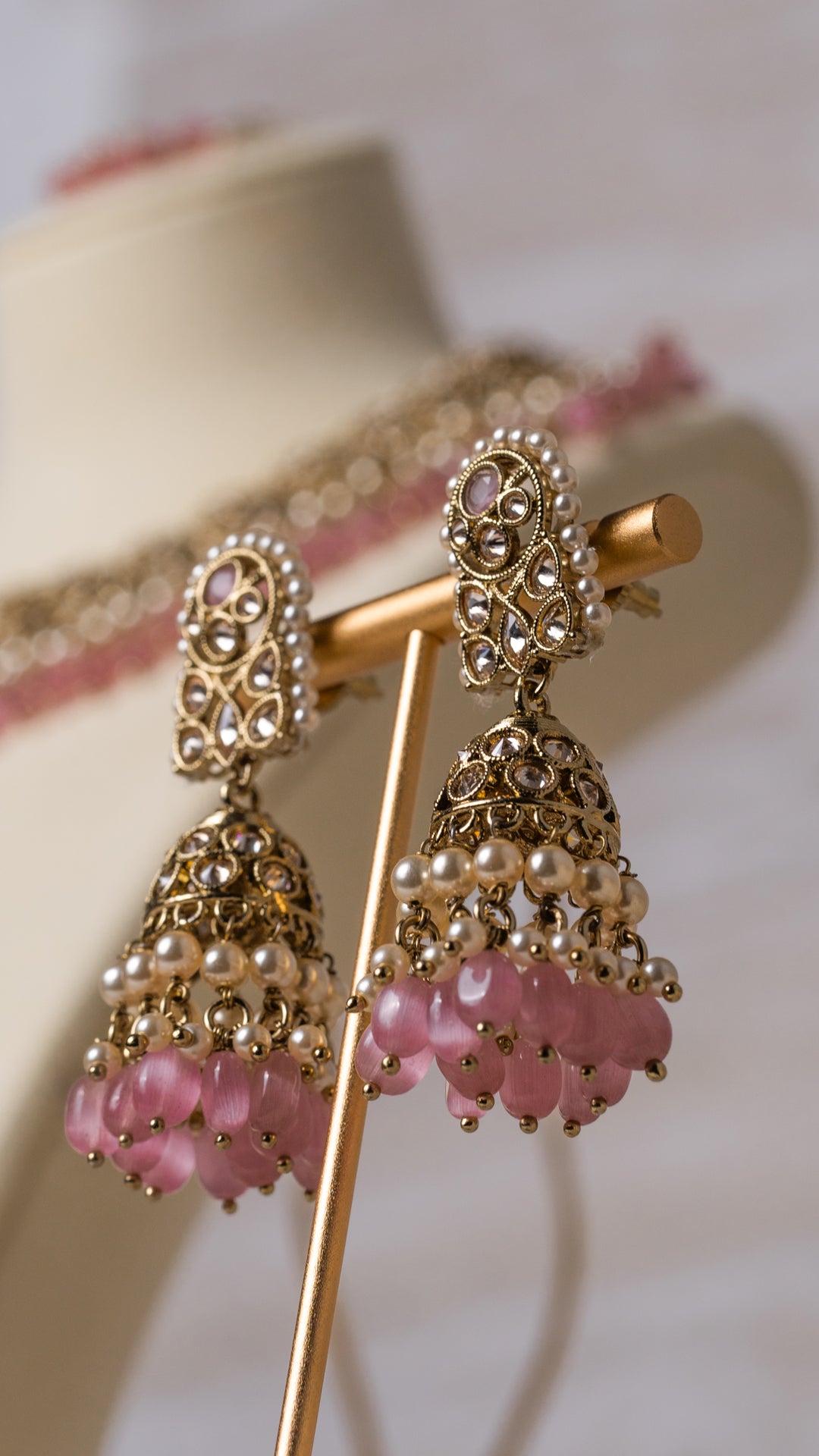 A pink pearl necklace set with elegant detailing and a high-quality finish. This full set includes a matching necklace, tikka, and jhumka earrings—perfect for festivals, events, and wedding wear.