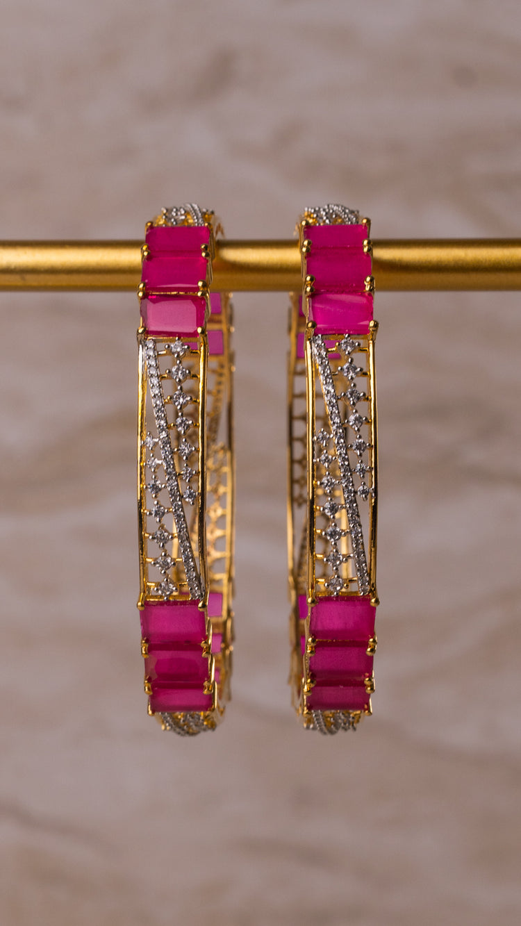 The Ora Bangles showcase a gold-tone base accented with bold ruby-pink stones and intricate crystal detailing through the centre. These bangles bring a bold yet graceful touch to festive and special occasions.