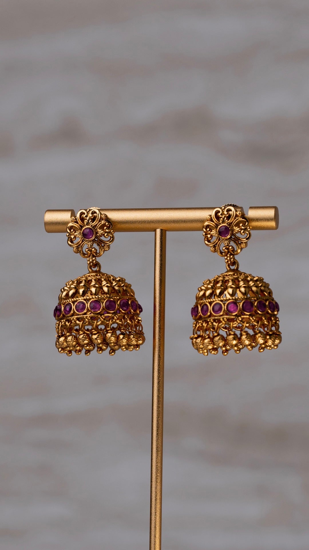 Matte gold-plated jhumka earrings with red stones, featuring a traditional design. Perfect Indian jewelry for festivals, and special occasions.