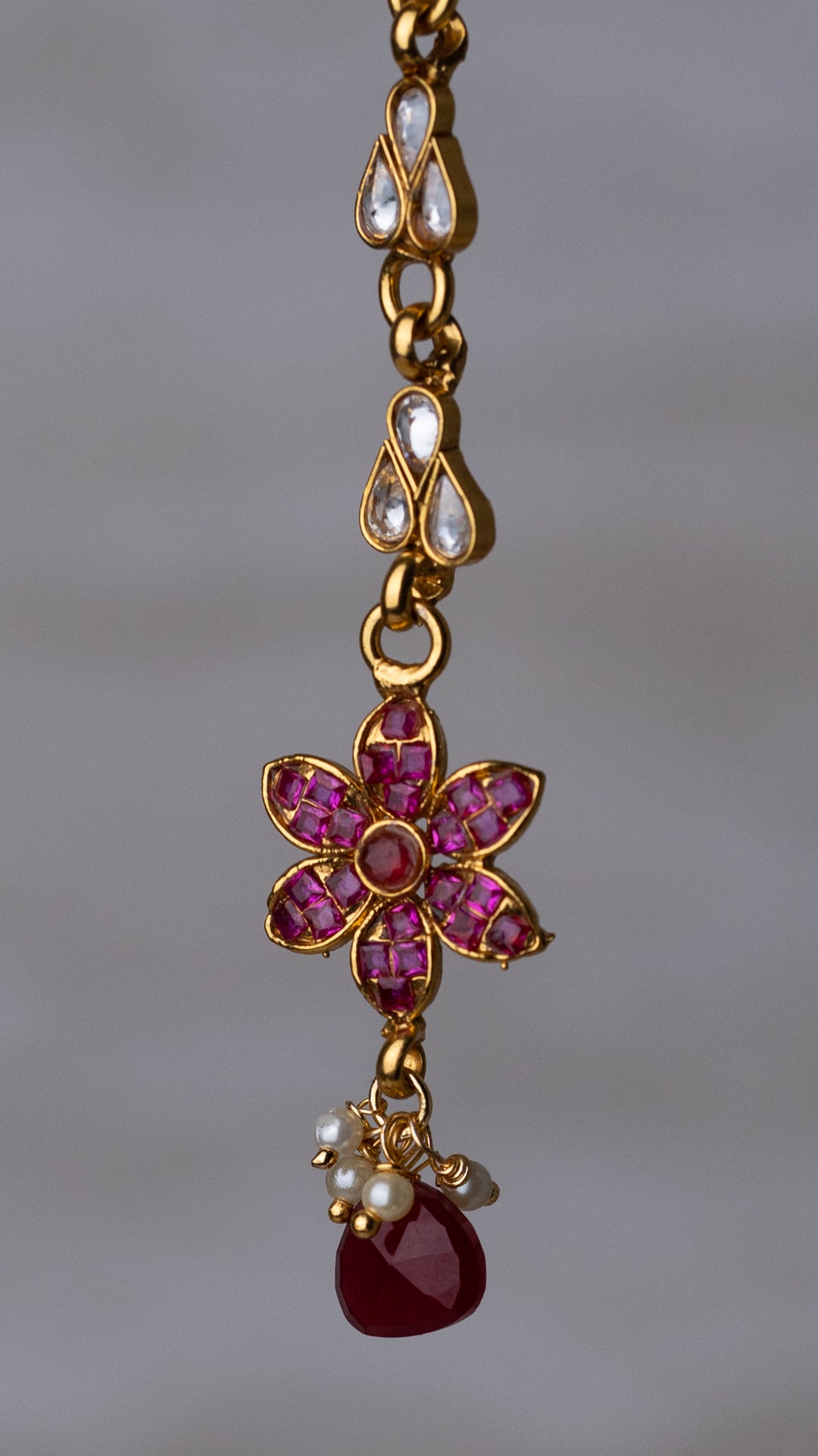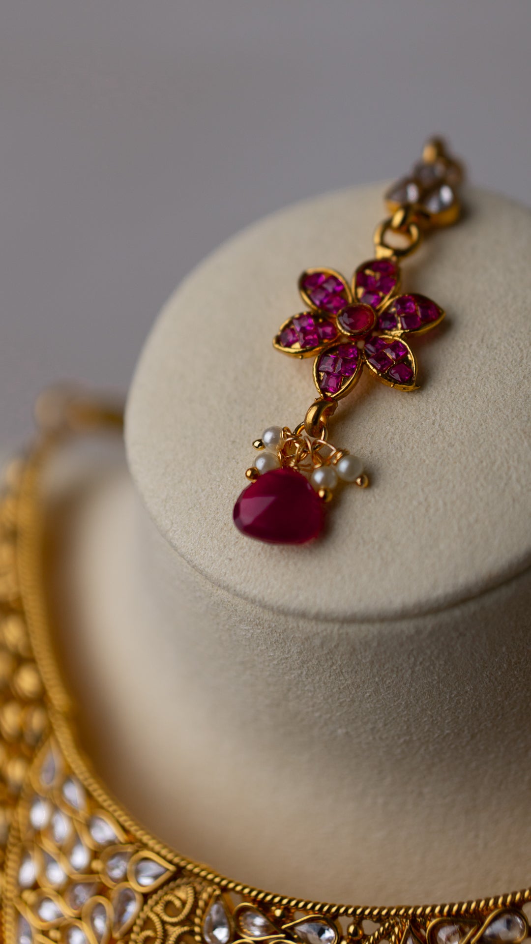 Gold-plated statement necklace set featuring a central ruby-pink flower, complete with matching jhumka earrings and tikka, each adorned with delicate floral accents. Perfect Indian jewelry for weddings, festivals, and special occasions.